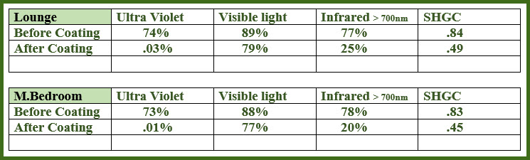 IR – Infrared Transmission – Infrared energy is that part of the energy spectrum that our eyes cannot see, but our bodies detect as heat. This transmission value is an indication of how effective the window glass is at blocking the Near & Far Infrared Energy (Heat) from passing through the window – the lower the value the less heat is able to transmit through the glass.
